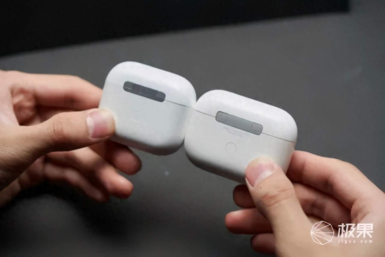 耳机的改变只是很小一部分,更大的改变在它的耳机仓上,“AirPods 3”的耳机仓看着更为小巧,虽然刚一看到,感觉和AirPods Pro并没有不同,但当两者进行对比时候,这种差距就特别明显。