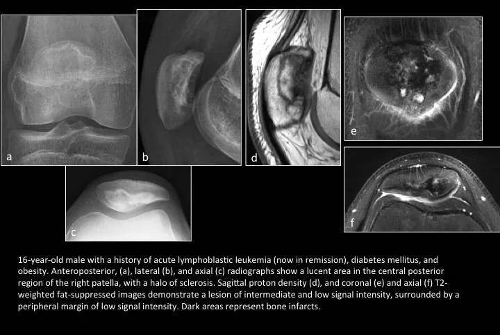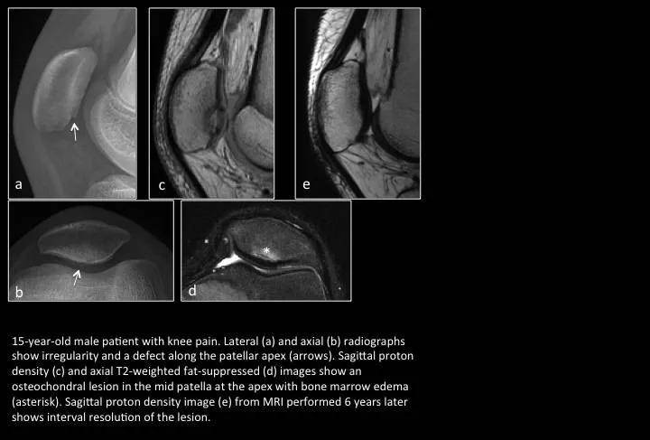 15岁男孩,膝关节痛。a,b图示髌骨下级不规则 缺损;c,d图示局部骨软骨游离伴软骨下骨髓水肿;e图示6年后复查,病灶修复。