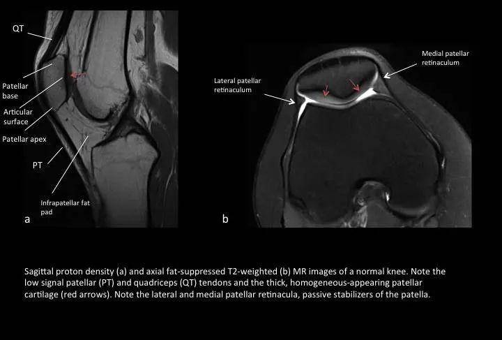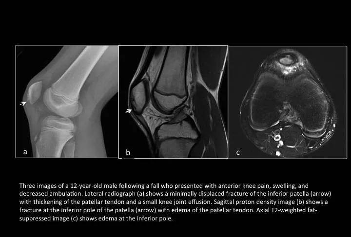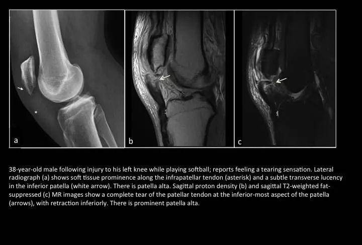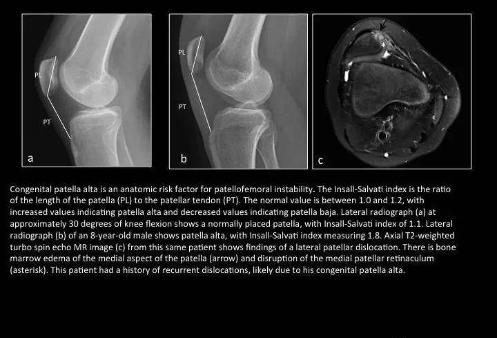 a图正常位置髌骨,髌韧带长度(PT)/髌骨长度(PL)正常比值为1.0-1.2(国内文献一般小于0.8提示低位髌骨,大于1.2提示高位髌骨);b图PT/PL比值为1.8;c图示髌骨脱位状态,局部骨髓水肿。