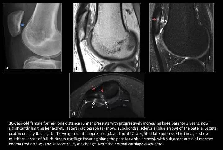 女,30岁,长跑运动员,进行性膝关节疼痛3年;运动受限就诊。