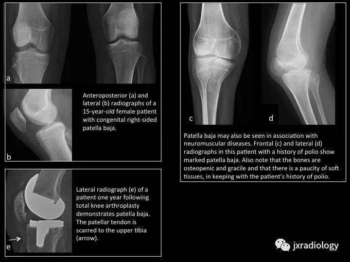 c,d图,低位髌骨也见于神经肌肉疾病;患者既往有脊髓灰质炎病史。