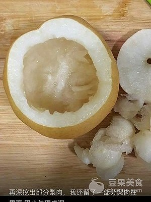 3、做梨盒,把梨的中间哇一个空间出来,注意不要挖太薄了,到时候要蒸的