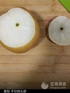 2、接下来就简单了,首先把雪梨平切头咱们来做一个梨盒