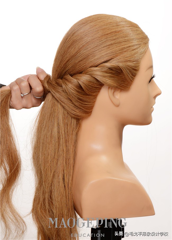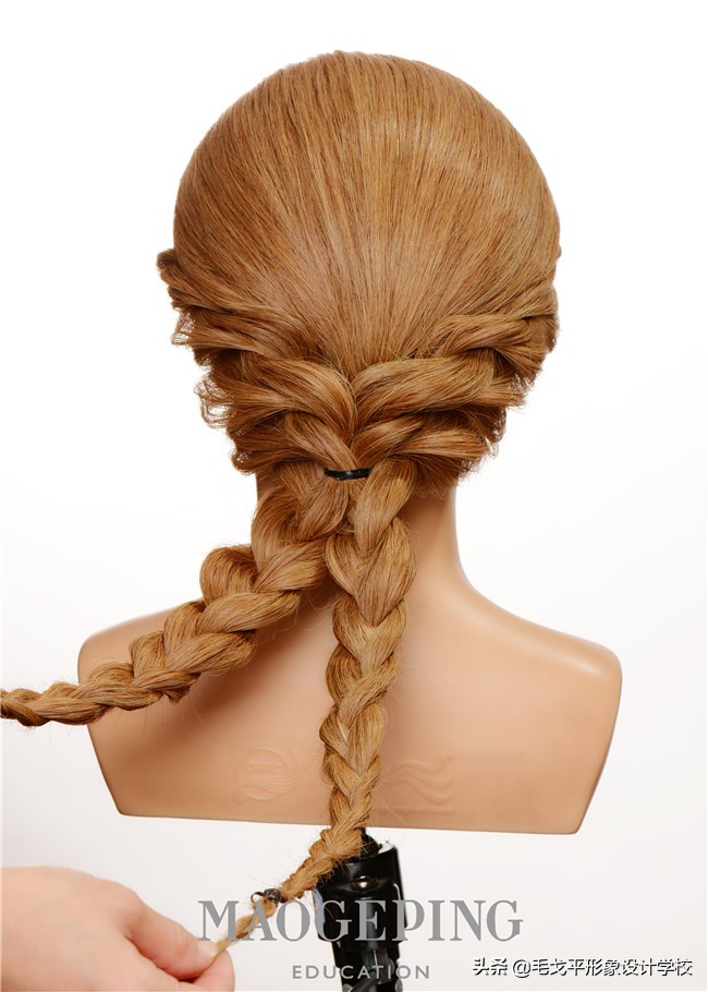 STEP9:另外一根发辫同样拉到反方向并固定。