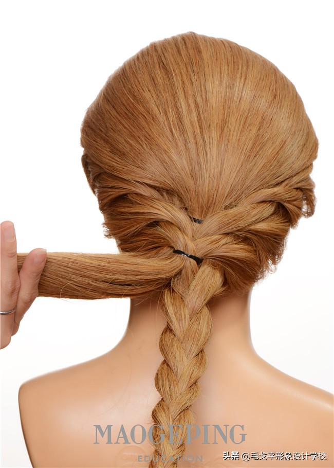 STEP8:将编好的发辫拉到上方反方向固定。