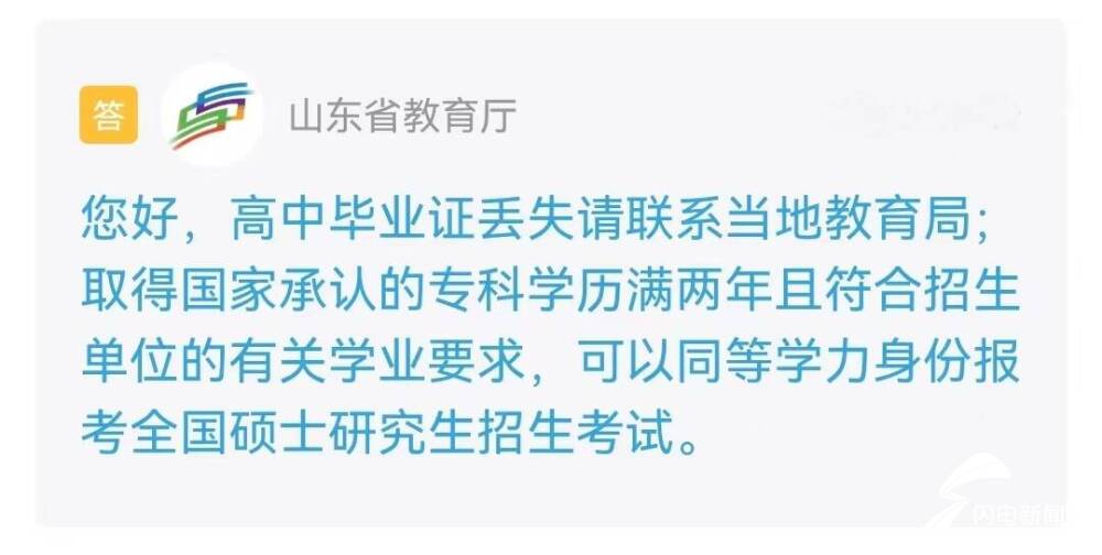 山东省教育厅进行了回复:高中毕业证丢失请联系当地教育局;取得国家承认的专科学历满两年且符合招生单位的有关学业要求,可以同等学力身份报考全国硕士研究生招生考试。