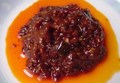 在闻到西瓜酱豆的香味儿以后,还要对他进行炒制,在炒锅中放油加热以后放入适量的花椒大料,炒出香味,然后把它取出不要,再倒入做好的西瓜酱豆加少量水炒匀,然后放入适量的剁椒和葱花以及姜末,等里面的水分收干以后,直接关火取出就可以。