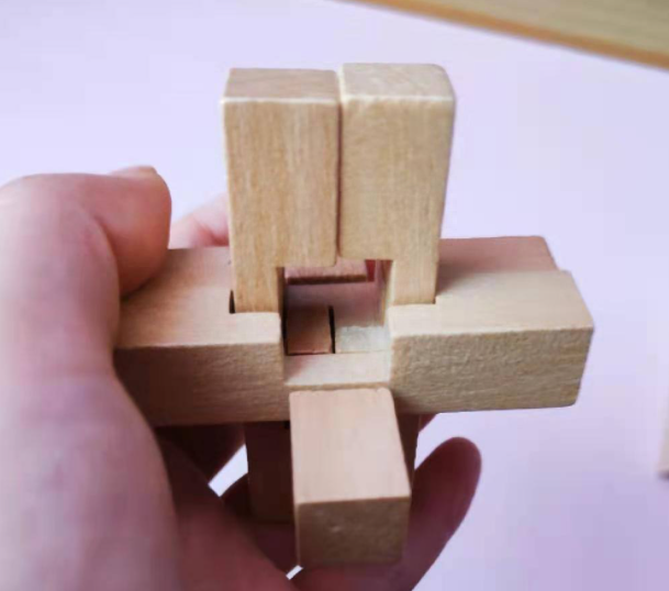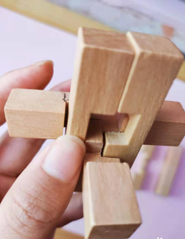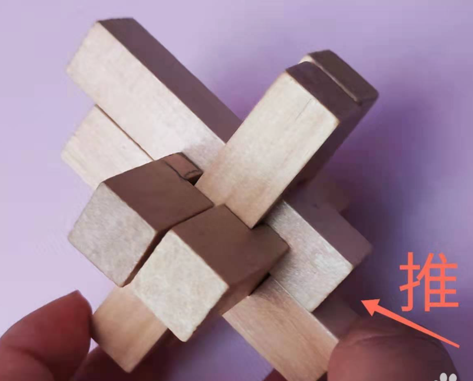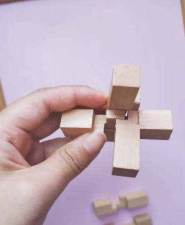 孔明锁的解法:孔明锁的解法十分简单,只需一步。孔明锁可分为6根或者3组,仔细观察会发现有一根没有扣,将这根一推孔明锁就全部解开了。