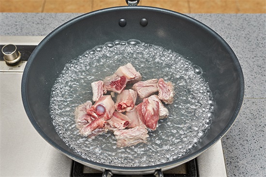 3. 锅内加入清水料酒大火烧开,放入排骨沸水至表面泛白。