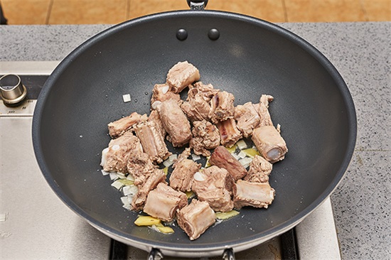 5. 锅内加入油烧热,葱姜爆香,加入排骨煸炒。