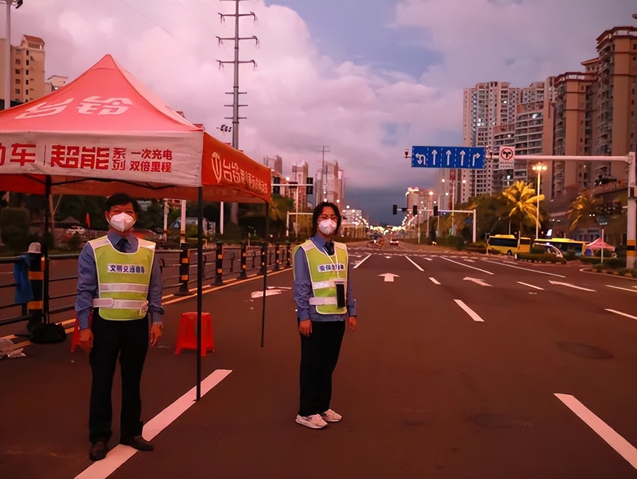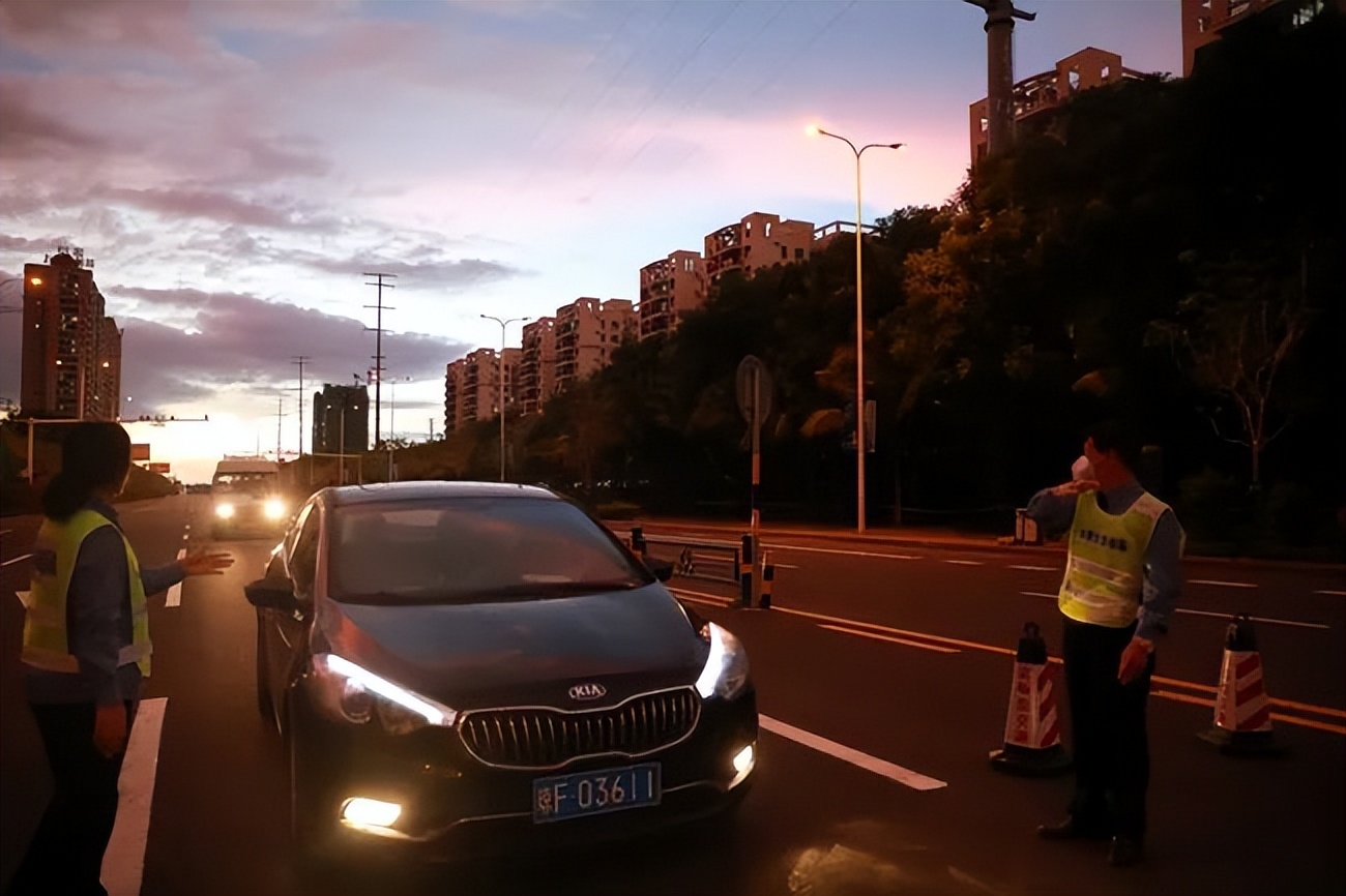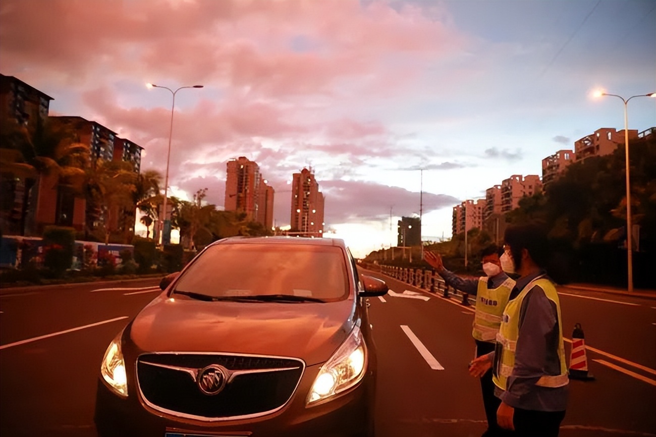 △晚霞下坚守在路口的工作人员。