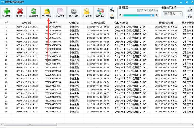 如果想快速保存查询的数据的话,我们可以点击“导出表格”,就可以将所有的快递物流信息导出到本地电脑上了。在表格中可以看到,所有的快递单号的数据都一目了然。