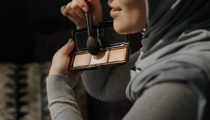 选择与肤色相近的粉底液,注意要适量,取少量均匀涂抹于面颊、鼻子、额头、下颚等部位,使用时可借助手指、海绵或者专用粉底刷,在全脸、耳朵及脖子上由内向外、由上往下,配合涂抹或者拍打的手法,获得均匀自然妆面。最后用海绵均匀拍打整个面部提高粉底附着力。干湿两用粉底上妆,干用时先从“T”字部位开始,由内向外推抹均匀,也适合补妆用;湿用时遮盖力较强,可用湿水海绵拧干至不滴水状态,先用海绵一角蘸取少量粉涂于面部,再用海绵干净部分将粉底推开。