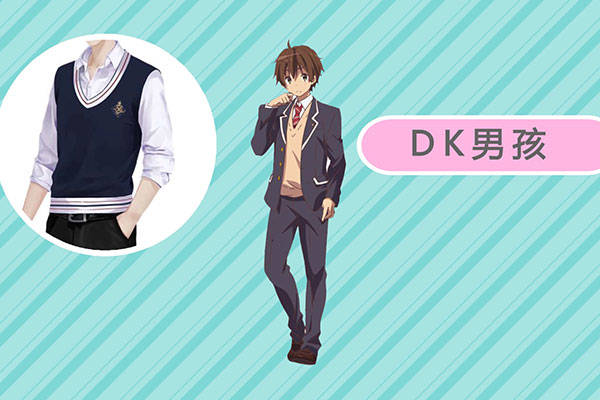 dk也有日语中男子高中生的意思,即“だんしこうせい”的缩写,在网络中,dk也可以直接指代日式的男生校服,如评价一个穿日式校服的男孩,可以说他是“DK男孩”,与之对应的,穿日式校服的女孩被称为jk。
