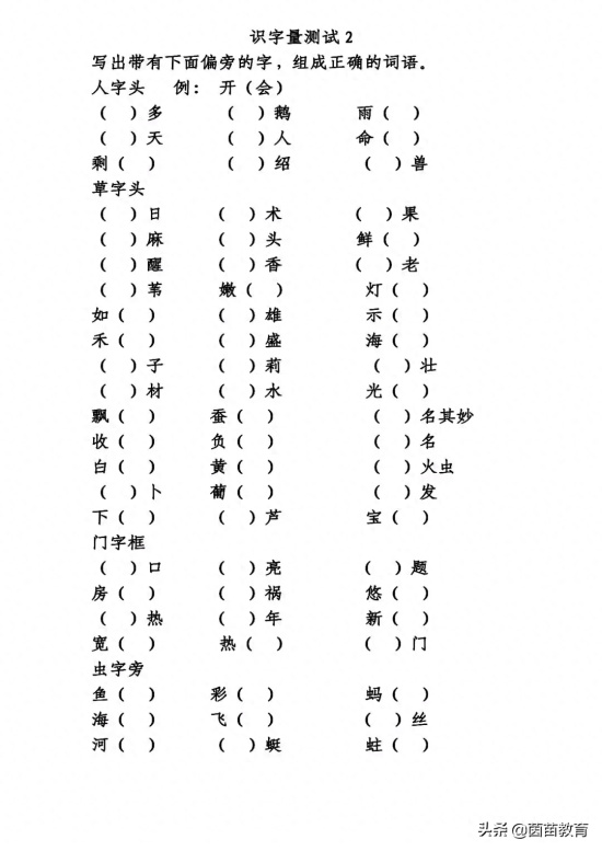 让我们一起做做下面这份练习吧,看看偏旁是人字头、草字头、门字框、虫字旁掌握了多少: