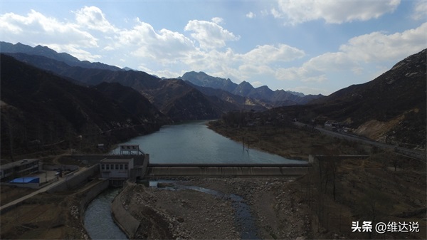 山西盂县,横跨在河流上的小水电站将河流切割成段。