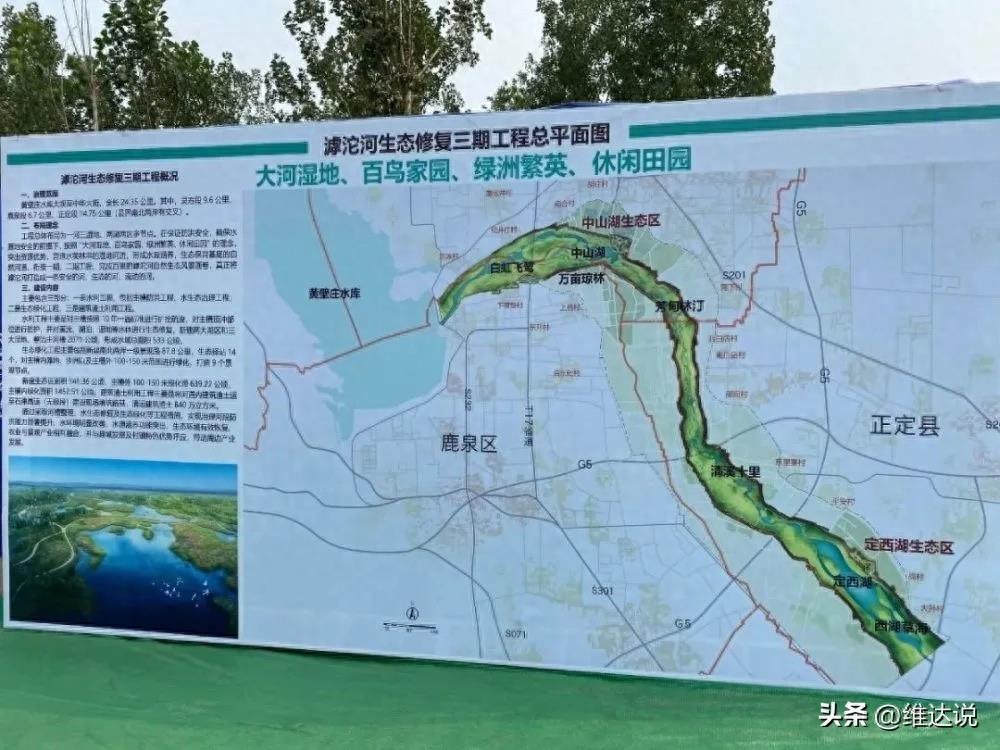 滹沱河生态修复三期工程进行了河槽整理、水生态修复及生态绿化等项目。两岸将形成一条的绿色生态景观长廊。