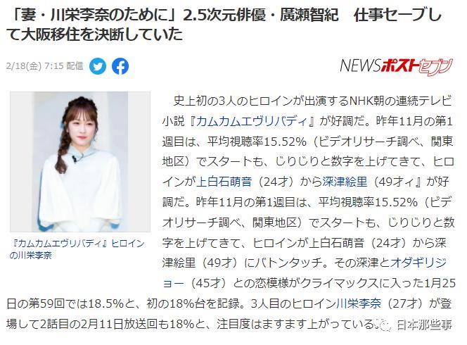 至于川荣李奈的丈夫,广濑智纪,在川荣李奈先去了大阪以后,他也在去年12月搬去大阪,为了陪伴妻子、孩子,他暂时停掉了所有的工作。