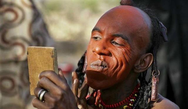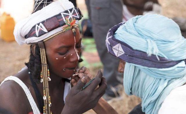 这就是位于非洲富拉尼族旗下的沃达贝部落。这个部落很有意思,虽然是游牧民族,但是每到偷妻节的时候,这里的男人们便少了那份可以征战四方的豪情,一个个全变成了浓妆艳抹的男人。这样的反差萌还是非常有意思的。