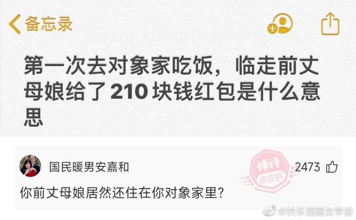 去对象家里吃饭,临走时丈母娘给了210的红包是什么意思?