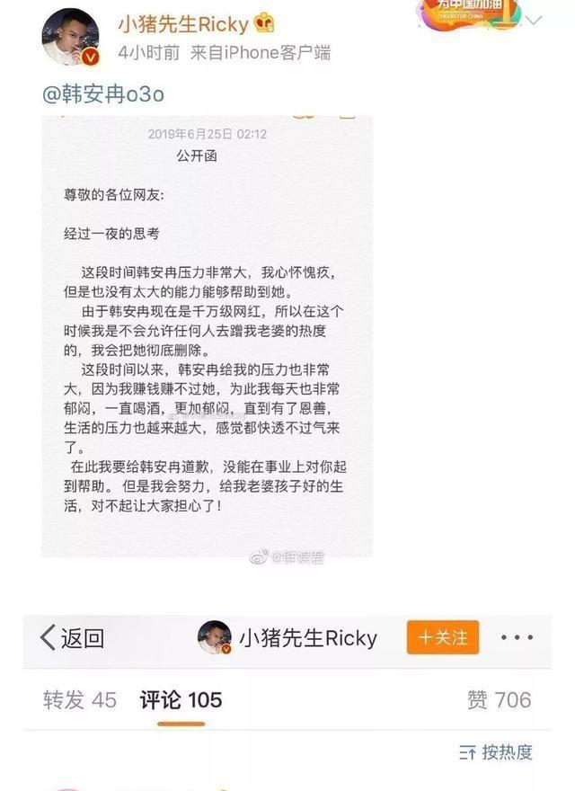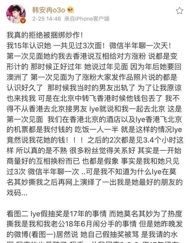 但是好景不长,韩安冉发现马文超出轨,于是在微博上向网友爆料,说马文超和自己谈恋爱是为了钱和名气。