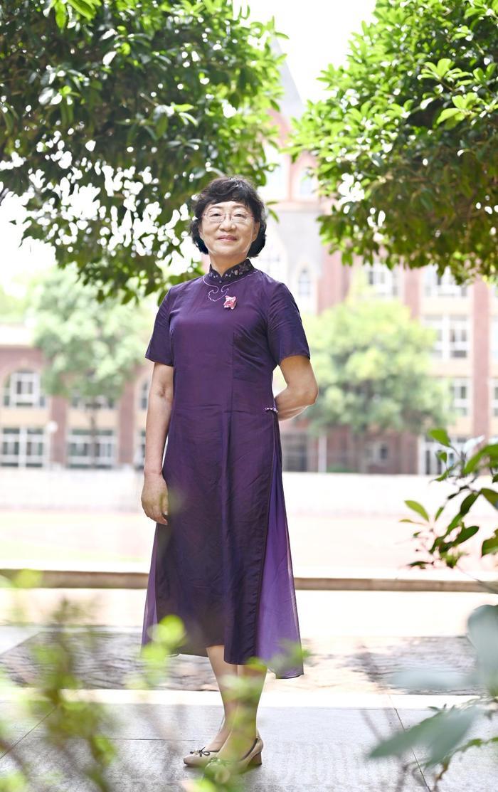 她穿着紫罗兰色的旗袍,胸口别着一朵浅粉色的绢花,那是学生刚刚给她戴上的。