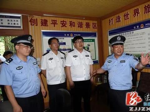 2015年,周符波(右2)在湖南张家界派出所了解旅游警务建设情况 图片来自红网