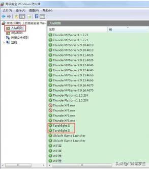 3、然后在左上角,你会看见入站规则,点击入站规则,在中间窗口里面找到如图所示的两个程序,这个就是火炬之光的程序,点击右键进入属性,更改设置为允许连接。两个都有改过来,这样,大多数都已经可以联机了。