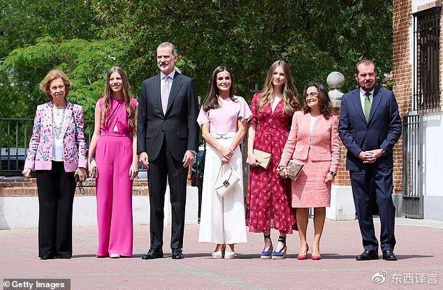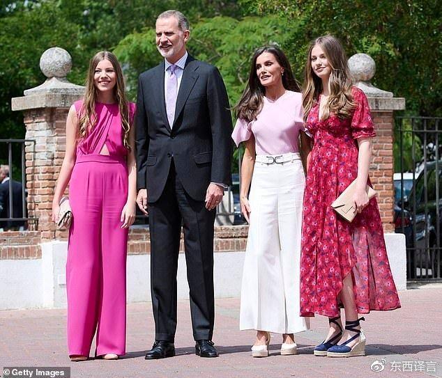 据英国《每日邮报》当地时间5月25日报道,西班牙索菲亚公主在她的坚信礼(Comformation ceremony)上展现了时尚魅力,这位16岁的小公主身穿一套芭比粉色的连体衣裤,与她的母亲莱蒂齐亚王后及姐姐莱昂纳尔公主组成母女装,再加上国王父亲挺拔的身材,这一家子真的很养眼。