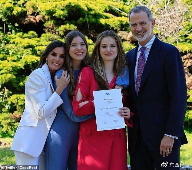17岁的大姐、西班牙王储莱昂纳尔公主本月刚刚从威尔士的UWC大西洋学院毕业,获得高中毕业证书,几日前,大公主在社交媒体上分享了一家四口庆贺她高中毕业的合影,看得出来,两位公主都已经比母亲个头更高了,而55岁的费利佩国王和王后妻子在女儿身边看起来也很是骄傲。