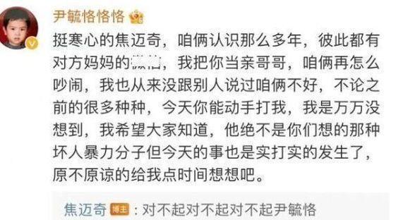 13日凌晨,尹毓恪突然发了一篇长文,整篇长文下来茶言茶语,让人看着十分奇怪。总结一点就是,他拿焦迈奇当亲哥哥,没想到他会动手打自己。