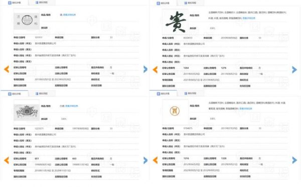 新京报记者查询中国商标网发现,上述第101911号、第1223571号、第8550010号、第9784875号商标均为“贵”,国际分类均为第33类,包含酒类,申请人贵州贵酒目前均拥有商标专用权。
