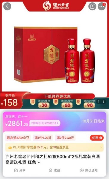 别着急,不少京东店铺同款商品虽然标价高,但点开之后,直接标明到手价 158元/2瓶,让你有种中大奖的感觉,还有个好听的理由“庆国庆、迎十一”。