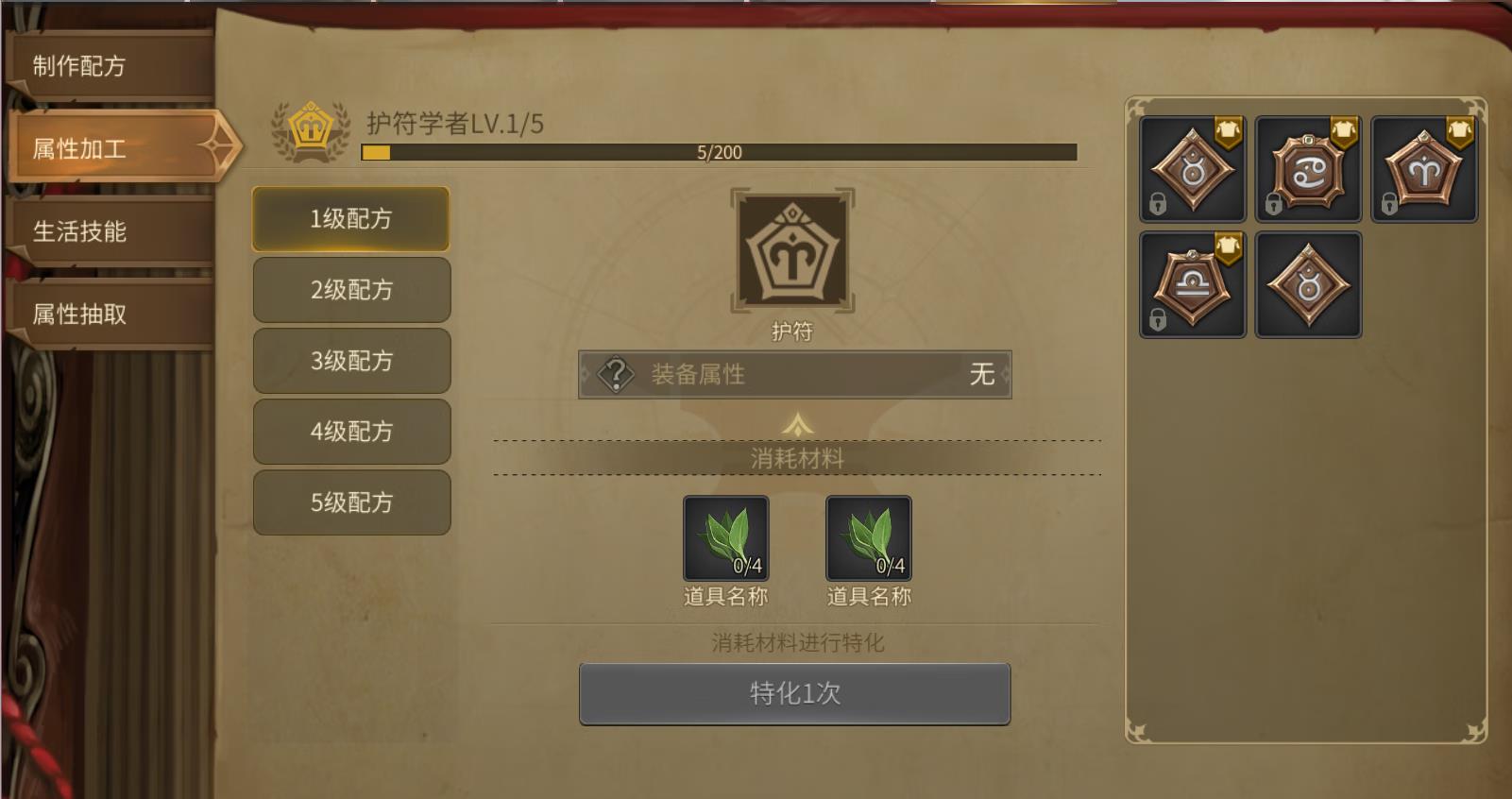 你可以消耗道具对护符进行特化,加工不同等级不同部位的道具可获得对应的属性,S品质属性为唯一属性,配方等级越高产生S品质属性的概率越高。