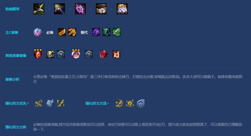 永恩必备“鬼索的狂暴之刃,分裂攻”第三件打神龙努努出锋刃,打婕拉出水银,却续航出汲取剑。多余大剑可以做旗子。前排布隆肉装即可