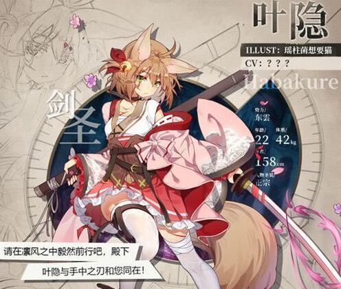 人物介绍:樱之国世代守护神主的”奉神众”武士之一,“破风一刀流”剑法传人。冰山、严肃、不苟言笑,拥有极高的剑术天赋,并因为其强大的实力而早早就被赋予了剑圣的称号。在妹妹日见子继承神主职位之后,便主动承担起了神主守护者的职位,发誓保护“圣树”与神主的安全。在第三次安息日中,为了守护妹妹牺牲自己而救活的圣树,叶隐在和厄兽瘟疫之子的对战中牺牲,但同时也彻底击退了瘟疫之子,完成了“守护圣树(神主)”的承诺。