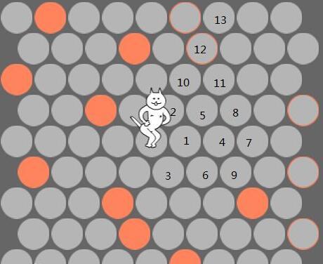 红色方块代表猫的起始点,绿色六边形代表你的开局第一子。红色数字代表猫需要那么多步才能跑过去,绿色数字代表你的子需要那么多步才能连过去。