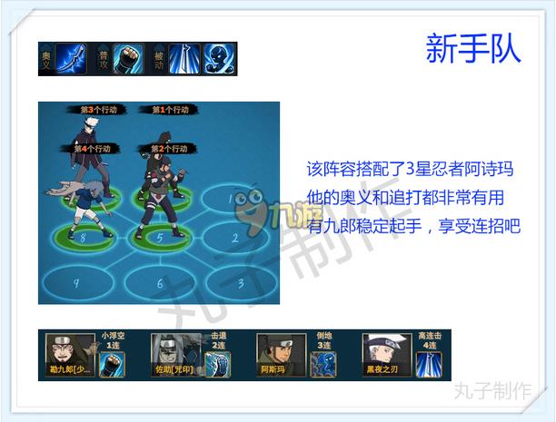 君麻吕一号位当盾,雷主二号位,带千鸟刀准备群体麻痹,重吾三号位负责给君麻吕和佐助上盾,并且承担了纯炮灰的作用,佐助君放置在四号位,负责第一回合开结界来增加场上3个雷属性忍者的伤害。