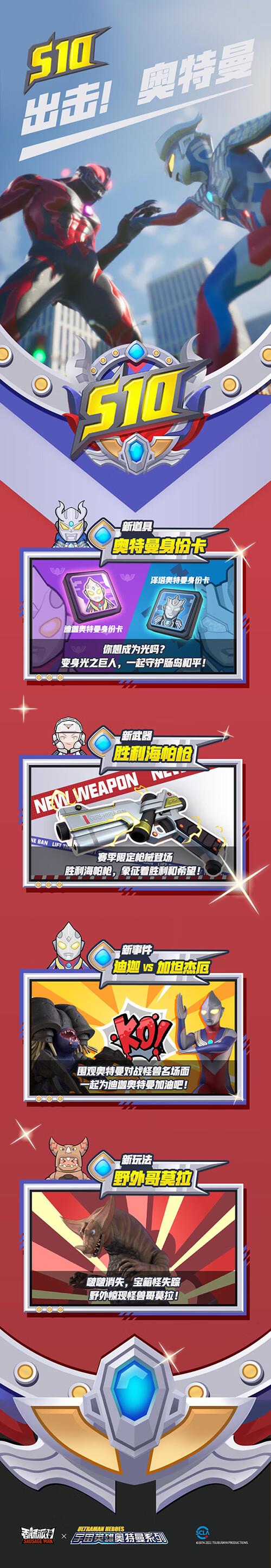 版本更新之后S10赛季正式开启,同时将会与奥特曼系列联动,其中包括了迪迦、泽塔、捷德、赛罗奥特曼皮肤,可以通过限定季票获取,除了皮肤之外还有下奥特曼身份卡可以获得,包括迪迦奥特曼身份卡、泽塔奥特曼身份卡限定的道具服,在武器方面自然也是少补了,全新的武器胜利海帕枪,游戏中真实的还原胜利队的专属配置手枪。