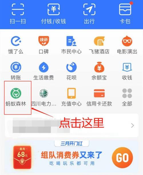 2、进入主页后点击蚂蚁森林,或在搜索框输入蚂蚁森林。