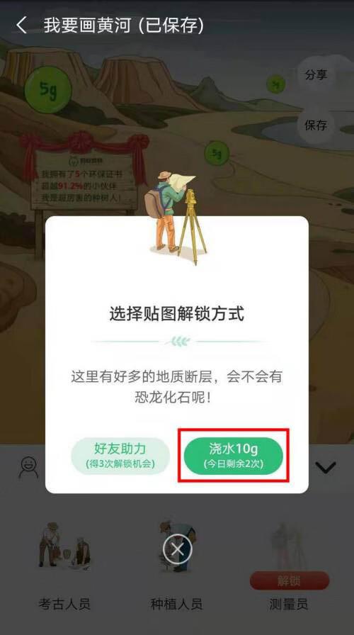 6、进入我要画黄河页面,点击下方贴纸列表中的解锁,此时会提示邀请好友助力或浇水解锁一张贴纸。