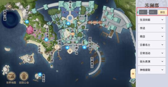 玩家可以来到商业街这里,然后来到这个坐标为苏澜郡630.406这里,也就是仙菇药剂的下面,然后可以使用探查模式,就可以看到有个蓝色的藏起的宝箱。