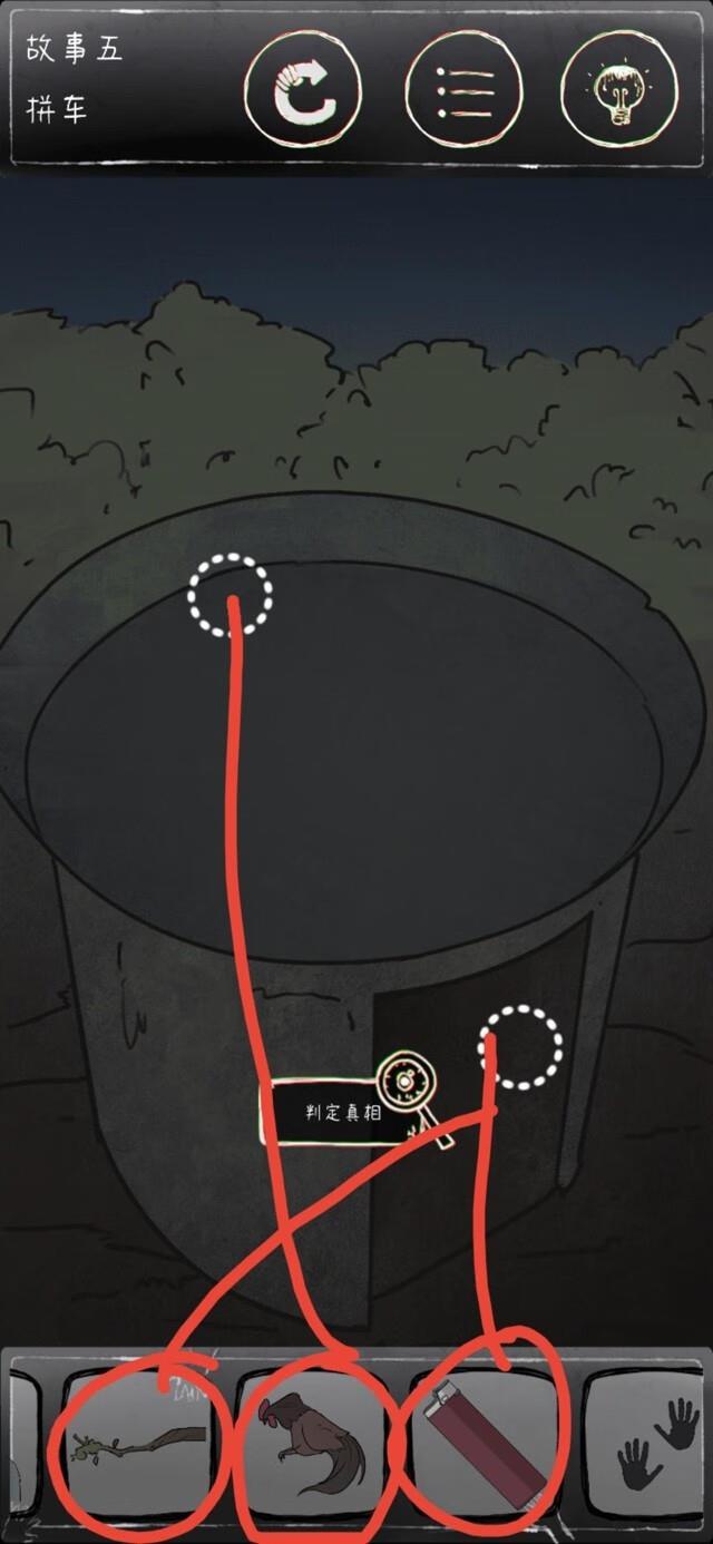 1、鸡皮疙瘩第五关拼车通关方法:把男女主放锅里,放上树枝,拿上打火机点燃。