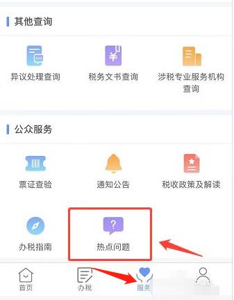 1、首先下载:个人所得税App,进入页面,点击底部“服务”,找到热点问题!
