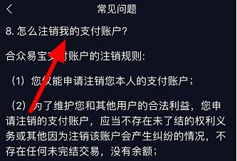 5、下拉找到“8.怎么注销我的支付账户?”,然后点击下方的“点击开始注销”黄字