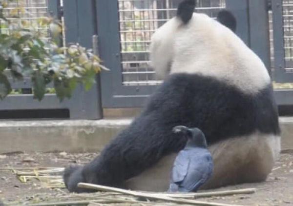 乌鸦偷拔熊猫毛搭窝,表情呆萌,网友:实在憋不住不笑