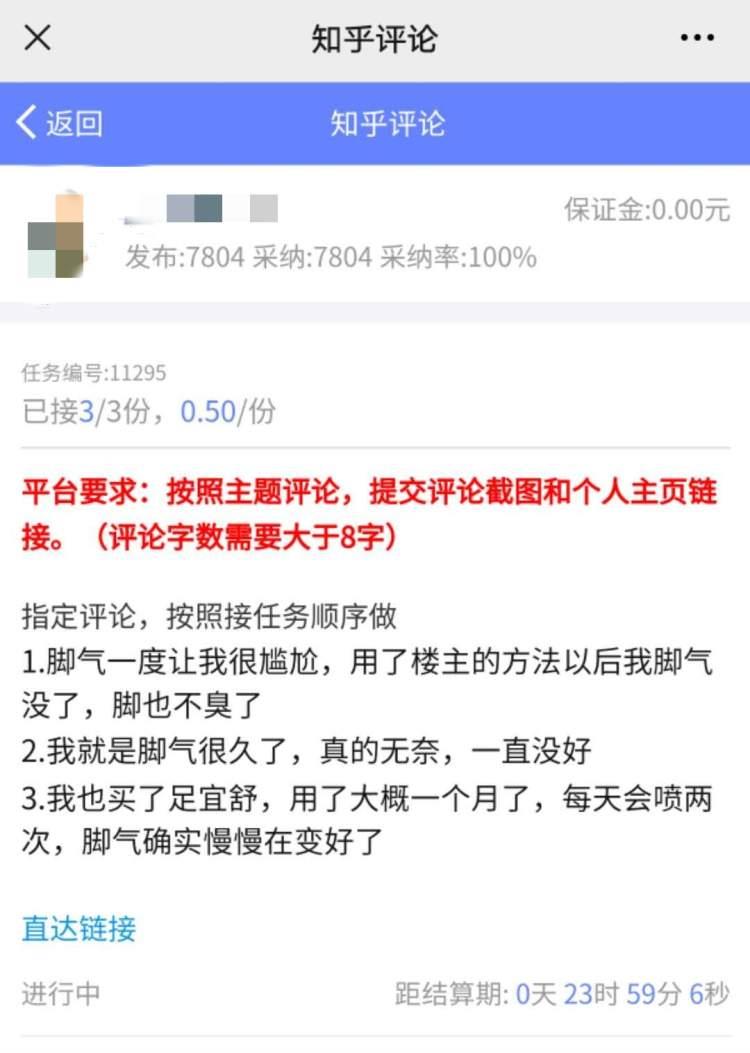 例如,在一个名为“知乎评论”的任务中,记者被要求随机选择诸如“我也买了足宜舒,用了大概一个月了,脚气确实慢慢在变好了”、“用了楼主的方法以后我脚气没了”等三条评论中选择一条,用自己的账号评论在指定的知乎问答中。
