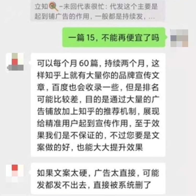 “每个月60篇,持续两个月,这样知乎上就有大量你的品牌宣传文章,百度也会收录一些,但可能排名比较差。这样做的目的是通过大量的广告铺放加知乎的推荐机制,展现给精准用户起到宣传作用。”他说,不只是大公司可以通过雇人发软文得利,一些小微企业,也可以通过雇人发软文的形式,获得客源。