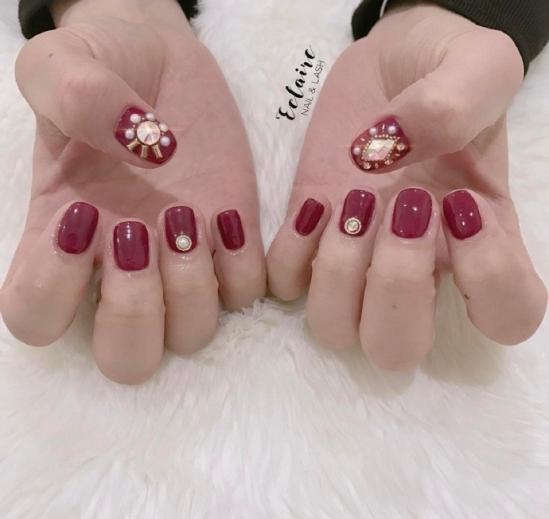 今年秋冬特别流行酒红色美甲,像这种带了钻的酒红色美甲就更显时尚感,颜色好看又显白,带一点钻设计会更抢眼呢。