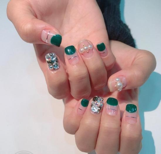 绿色是一种非常吸睛的颜色,半涂设计的绿色美甲一样很抢眼,配一点钻搭配,立马让整款美甲变得时尚大气起来。
